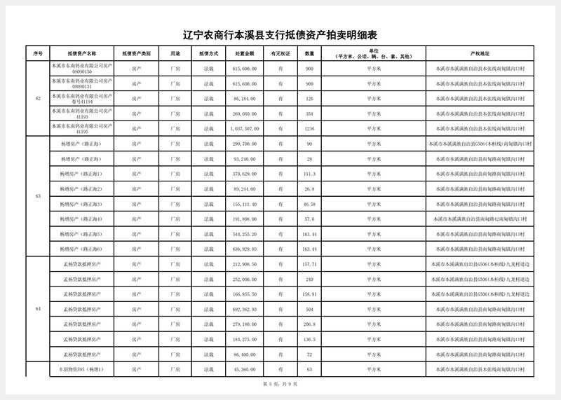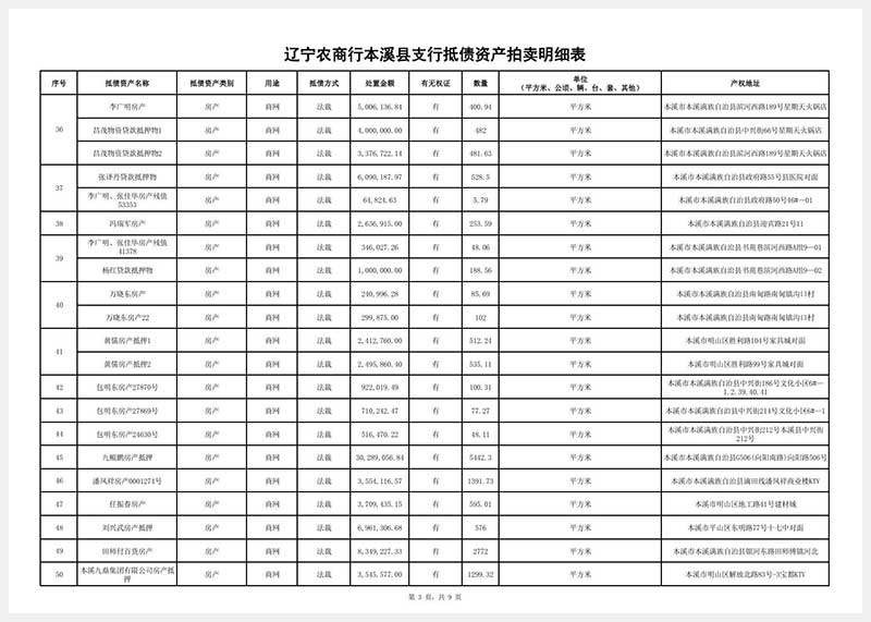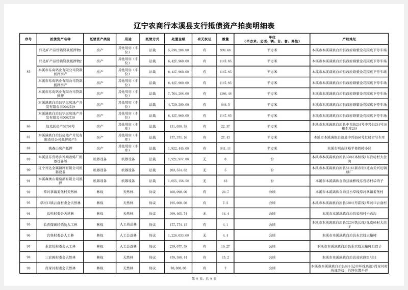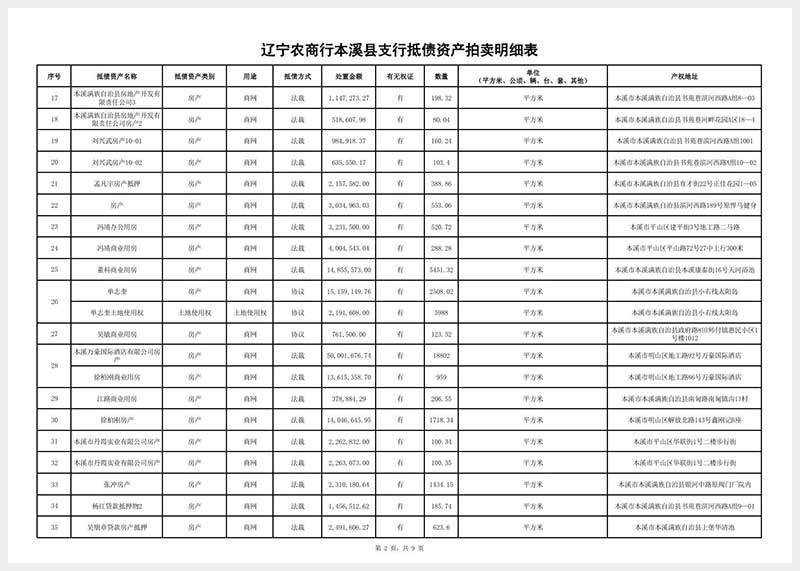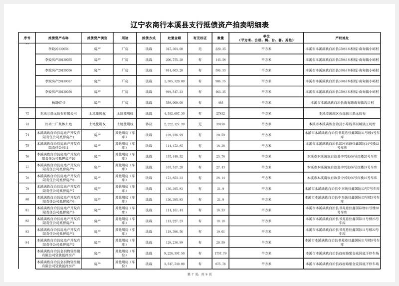 受委托定于2025年12月4日13:28分—12月5日14:28分在遼寧省公共資源拍賣網(wǎng)www.lngp.org.cn舉行金融機(jī)構(gòu)抵債資產(chǎn)拍賣會(huì),對(duì)以下資產(chǎn)進(jìn)行公開(kāi)拍賣:①燈塔市萬(wàn)寶橋街道天福新城E區(qū)54號(hào)樓54-3號(hào)房產(chǎn),面積:149.18㎡,起拍價(jià):36.45萬(wàn)元;②燈塔市萬(wàn)寶橋街道天福新城D區(qū)25號(hào)樓25-2號(hào)房產(chǎn),面積:180.82㎡,起拍價(jià):44.55萬(wàn)元。另有:①土地使用權(quán)及工廠廠房廠地場(chǎng)地工業(yè)園等房地產(chǎn)類②辦公樓住宅公寓別墅門(mén)市網(wǎng)點(diǎn)車庫(kù)商鋪檔口賓館酒店學(xué)校村舍等房產(chǎn)類③非農(nóng)建設(shè)用地和農(nóng)用地等集體土地使用權(quán)及地上建筑物及建筑附屬物④機(jī)器設(shè)備車輛玉石等物資類⑤林地林木林權(quán)類⑥金融機(jī)構(gòu)閑置資產(chǎn)等,共計(jì)近兩百項(xiàng)資產(chǎn)(明細(xì)表附后)公開(kāi)拍賣,以上資產(chǎn)均有瑕疵。起拍價(jià)保留價(jià)以委托方通知公布為準(zhǔn)。詳情參考本公司網(wǎng)站www.lnjhpm.cn或到本公司查閱拍賣標(biāo)的明細(xì)及拍賣文件。